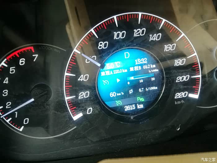 15:32分,69.2公里处,定速巡航中,油耗到了6.7L。