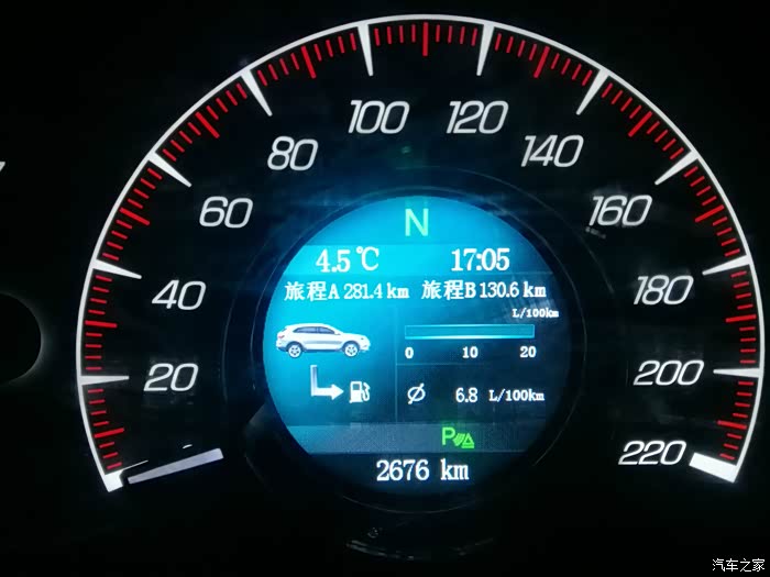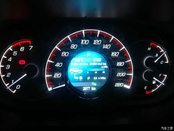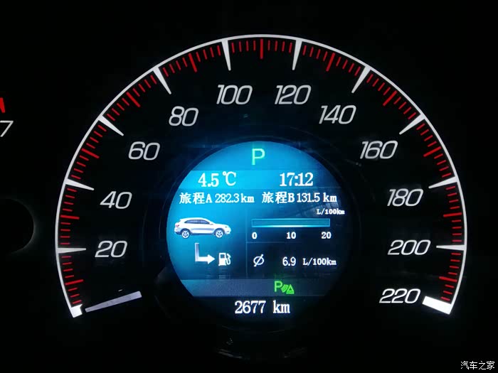 17:12分,131.5公里,转个弯到小区楼下停车,油耗表显示6.9L.总里程2677公里。