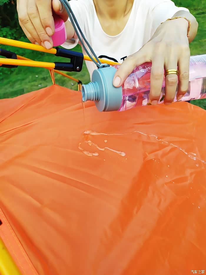 测试一下外帐的防水能力,可以看到水珠对面料没有任何渗透,说明防泼水的能力不错,下雨的话是完全没问题