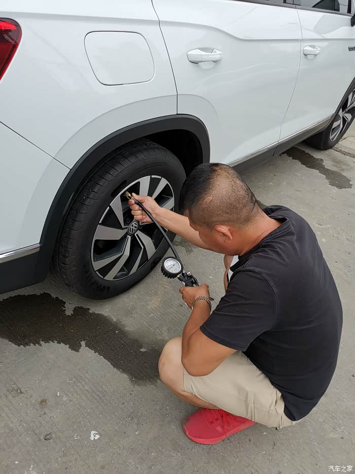 老板非常热情的帮忙测了四个轮子的胎压,发现后轮的胎压均在3.0Mpa偏高的,还帮忙调整了下。
