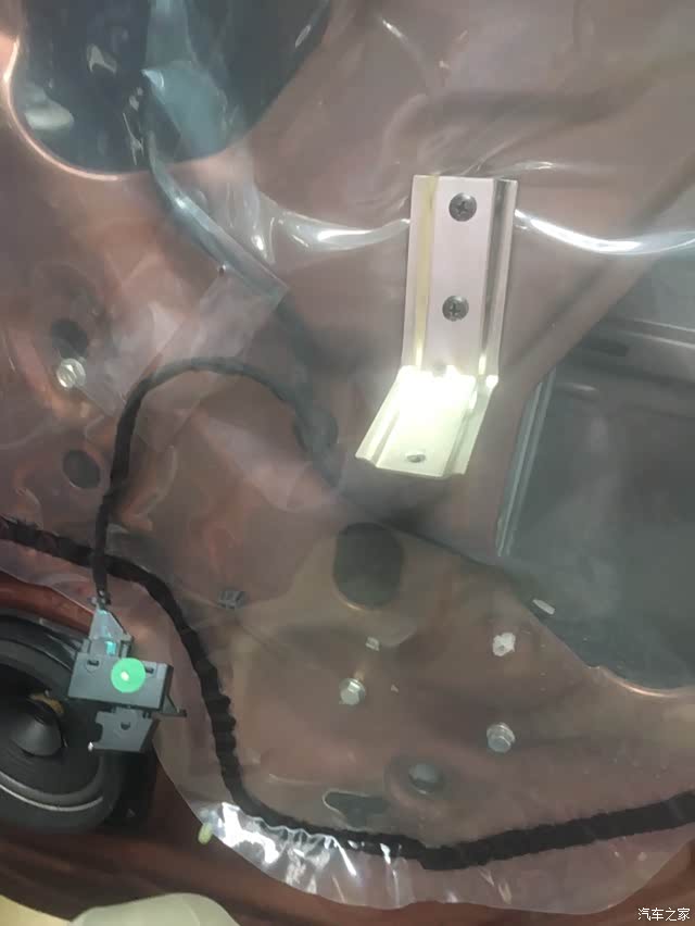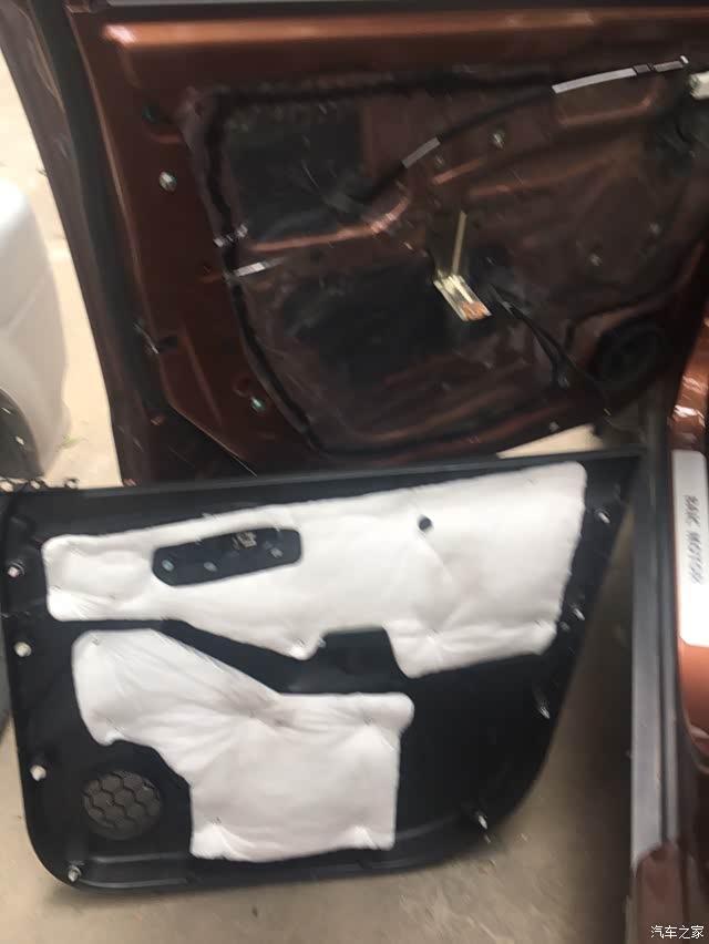 揭开下部后再卸掉喇叭,别问为什么。然后用毛巾将门板擦一遍,就可以开贴了,将隔音棉裁成约25CM条状,然后揭开一头的黄蜡纸约15CM慢慢通过那大孔进入门板內,这时你发现卸喇叭的作用了。先将一端到位贴紧就可以边揭蜡纸边按紧了。将门內全贴好后相反程序安回即可。到此一个门就算搞完了。