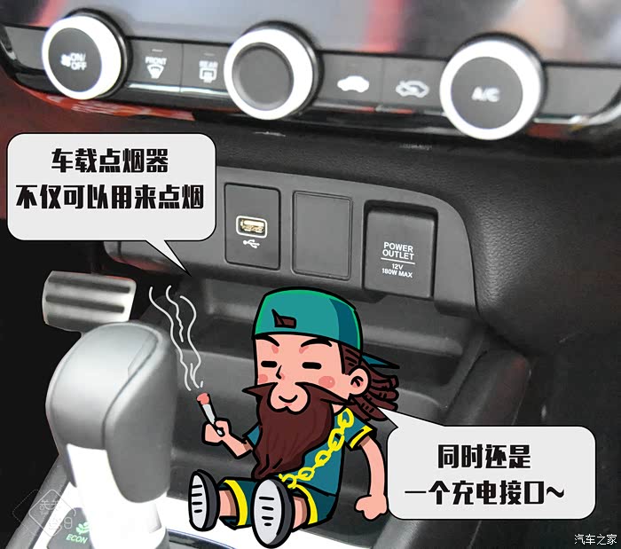 空调下方的位置提供了USB接口和点烟器接口,算是小型车的常规配置了。