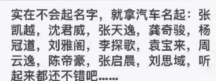 昨天看到朋友圈有朋友发了一段话,说实在不会给孩子起名字,就拿汽车名字起:张凯越,沈君威,张天逸,龚奇骏,杨冠道,刘雅阁,李探歌,袁宝来,周云逸,陈帝豪等听起来还都不错吧