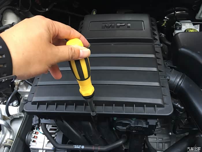 打开发动机仓,发动机上面黑色的盒子里面就是空滤,有8颗螺丝,必须先取下。