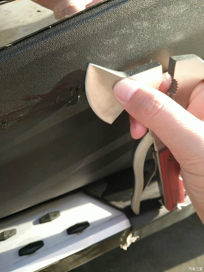找来随车安全锤,这面是锋利的斧子,防身也很不错的,就不上楼找工具了,用它刮一刮吧,弄得再顺溜些