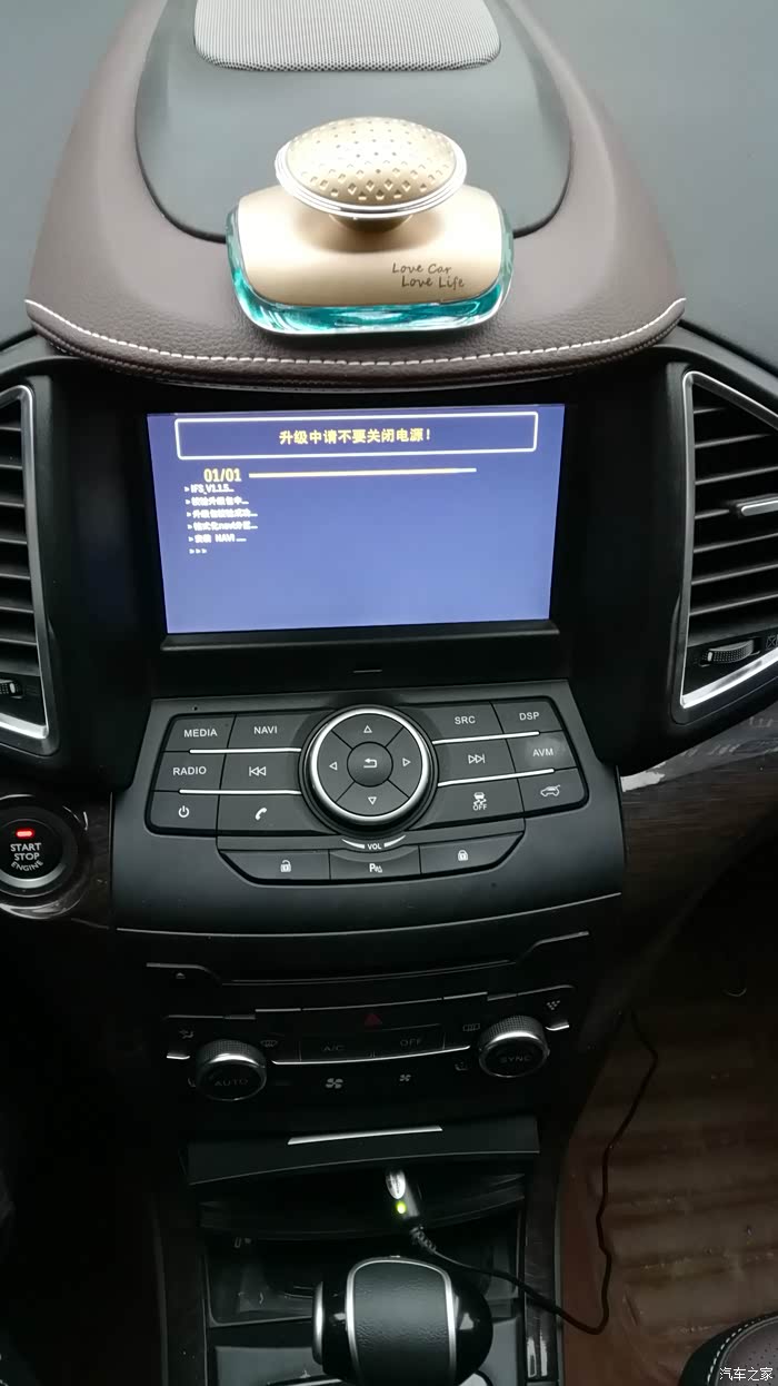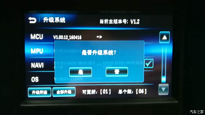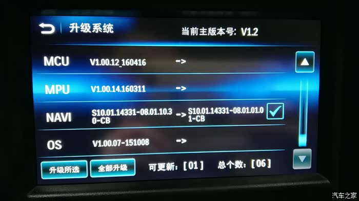 将U盘或者读卡器插在点烟器旁边的USB口上。如果电瓶电量足,可以不用打火,按一下一键启动键打开中控屏,如果电瓶经常亏电,建议打火后操作,因为升级过程需要二十分钟左右,升级过程不能断电。打开中控后,会自动进入升级界面,如图,点击右下角向下的三角号下拉菜单,在NAVI一项,出现了一个选项框,点击选中,再点左下角的升级所选按钮。