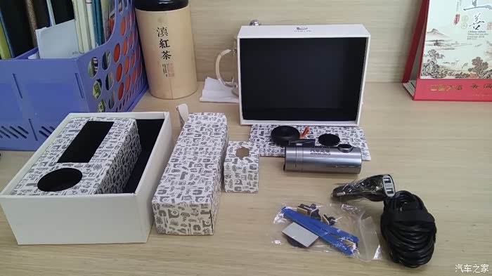 配件:一个钢琴烤漆的点烟器转两个USB口的电源,一条USB口转MiniUSB口的电源线,长度足够从主机引到中控台。还有一包安装配件(两个撬棒五个线卡)和备用的一套3M胶。