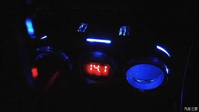 两个点烟器口,中间一个LED屏,可以显示电瓶电压,一般车辆打火状态,电压在14V左右。熄火状态只开启车辆电源,电压在12V左右。