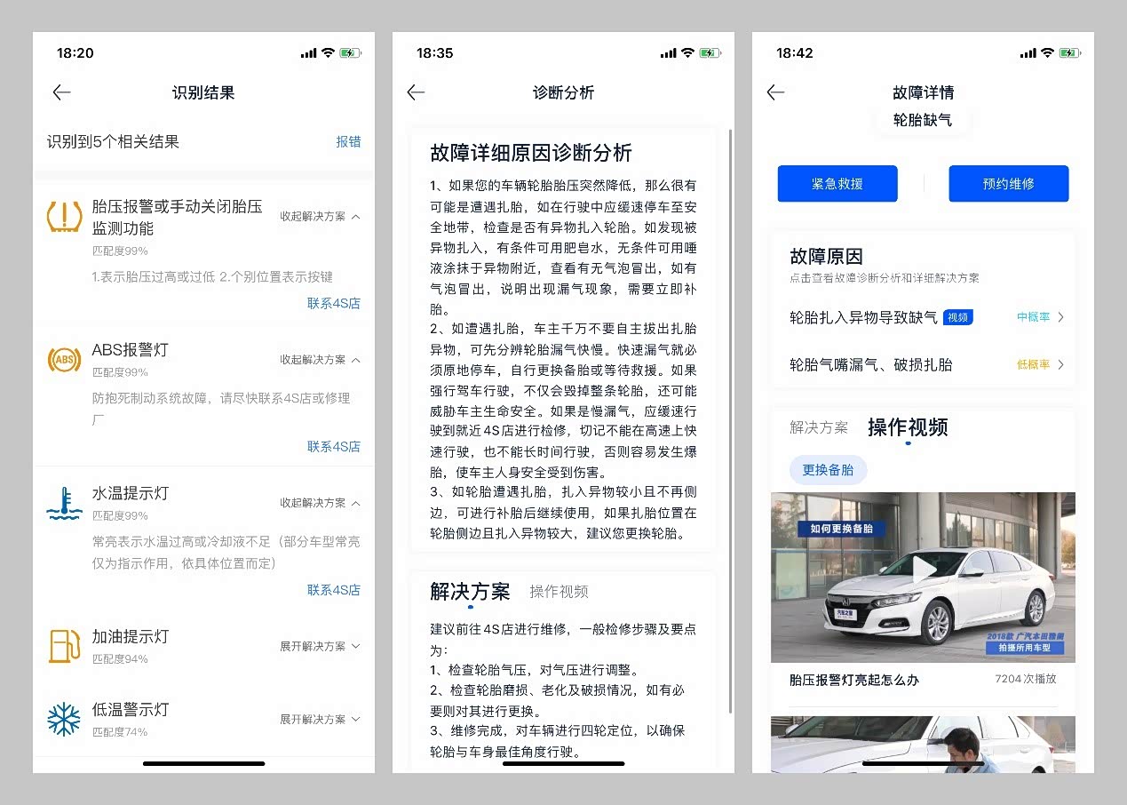 在进一步体验“故障通”工具后发现,在它的功能分类里,除了拍照识别故障灯,还可以通过搜索栏或查询汽车点位得到更加具体的故障原因诊断分析和解决方案。以轮胎缺气为例,除了详述故障原因和应对措施外,还有专业技师出镜以视频形式教授如何更换备胎,看过视频,新手小白也可以自己动手试着换胎。