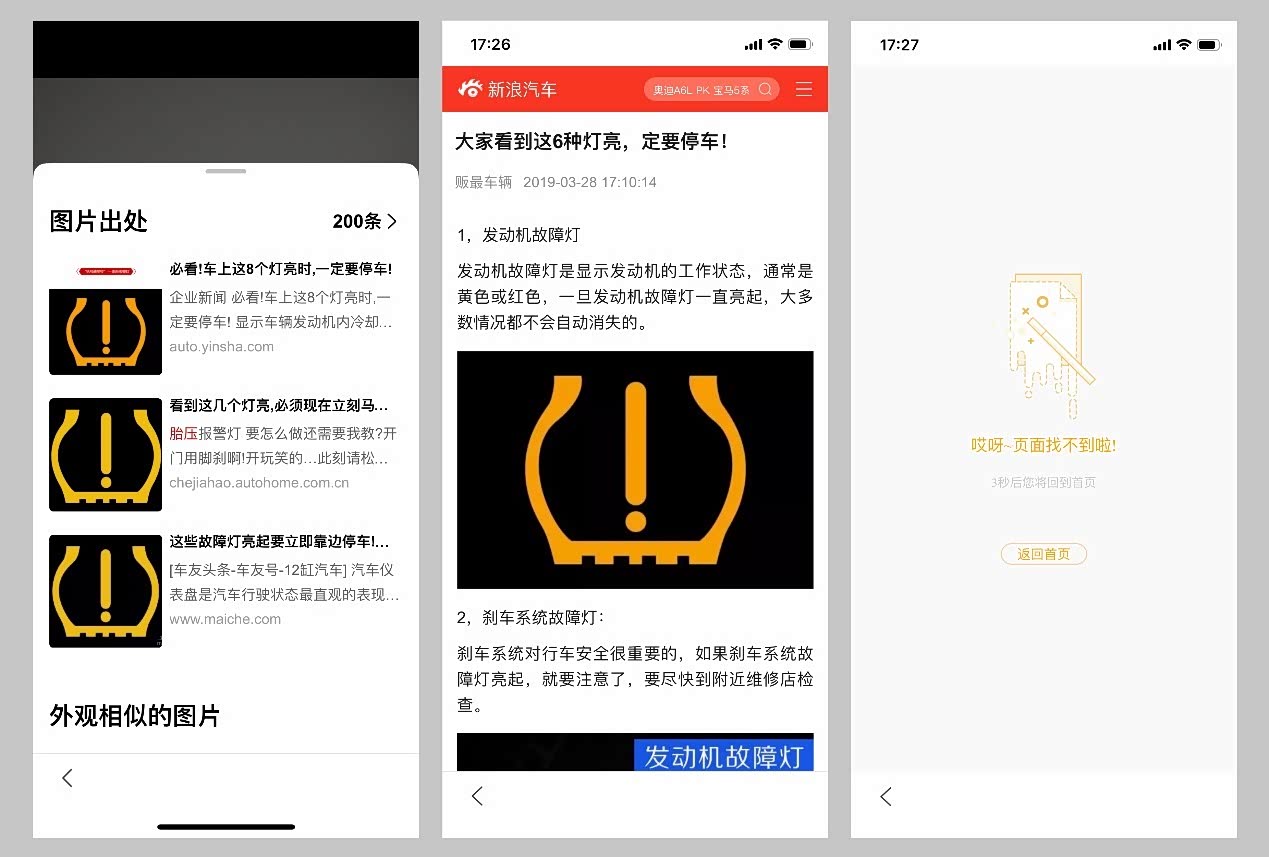 以胎压报警灯为例,我们首先看识别结果:搜索后展示的是含有该故障灯图片的文章,以及与该故障灯外观相似的图片。不单独针对故障灯做出解释,不能指明故障灯类型。进一步打开对应文章,时有链接失效的状况出现,部分文章可查看,但少有单独介绍所搜故障灯的内容,综合性强,但不够深入,人工测评下的解决率不高。推荐指数2颗星。