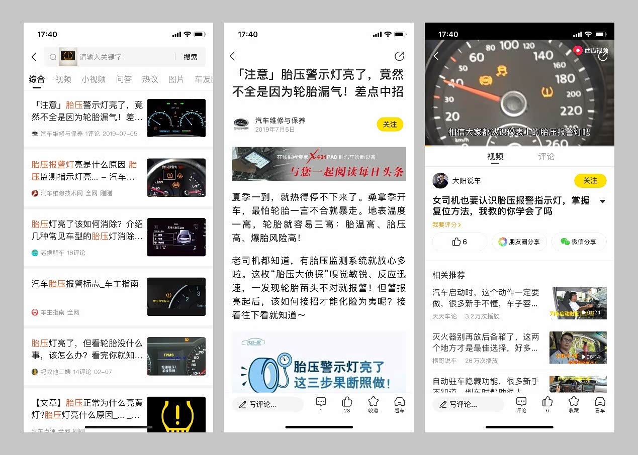 同样保持识别胎压报警灯不变,打开懂车帝App点击右上角扫码按钮,对准故障灯拍照,搜索结果反馈为一系列收录在App中的文章,点击文章详情,显示不同作者对该故障灯的解读,分为图文和视频两种内容形式。