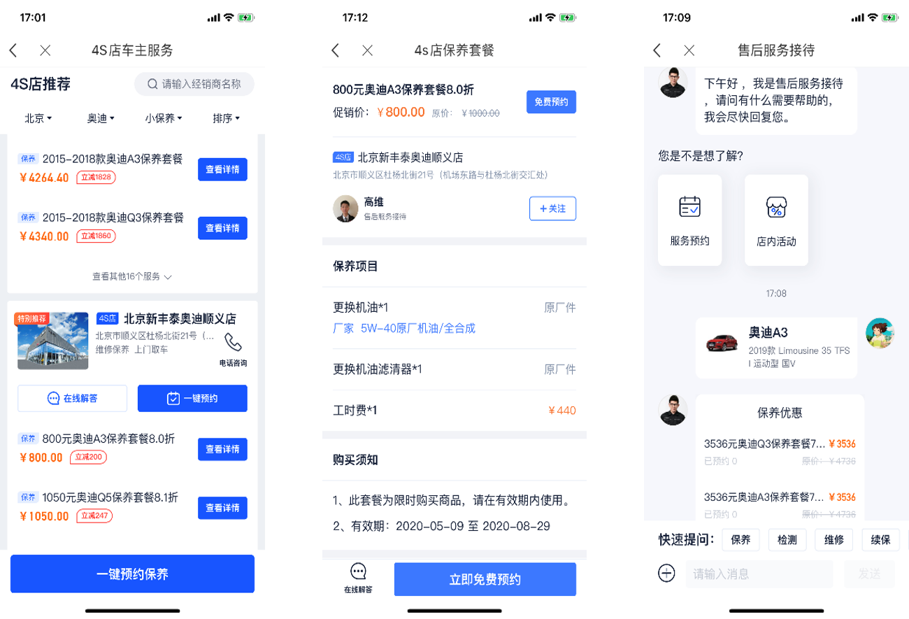 养车之家是汽车之家搭建的后市场服务平台,专门针对车主“用车养车”提供服务,除独立App外,在汽车之家首页“用车出行”也开有入口。我们首先在App首页添加车辆信息,点击“4S慧保养”,页面跳转至保养类型选择(大小保养)和门店列表页,它的套餐选择有两种:单次保养和多次保养,配件默认原厂件,点开“查看详情”可以看到具体的服务明细。车主可通过电话咨询或在线问答两种方式与4S店联系。预约成功后,汽车之家与4S店均在当天再次电话确认预约信息,全程免费。