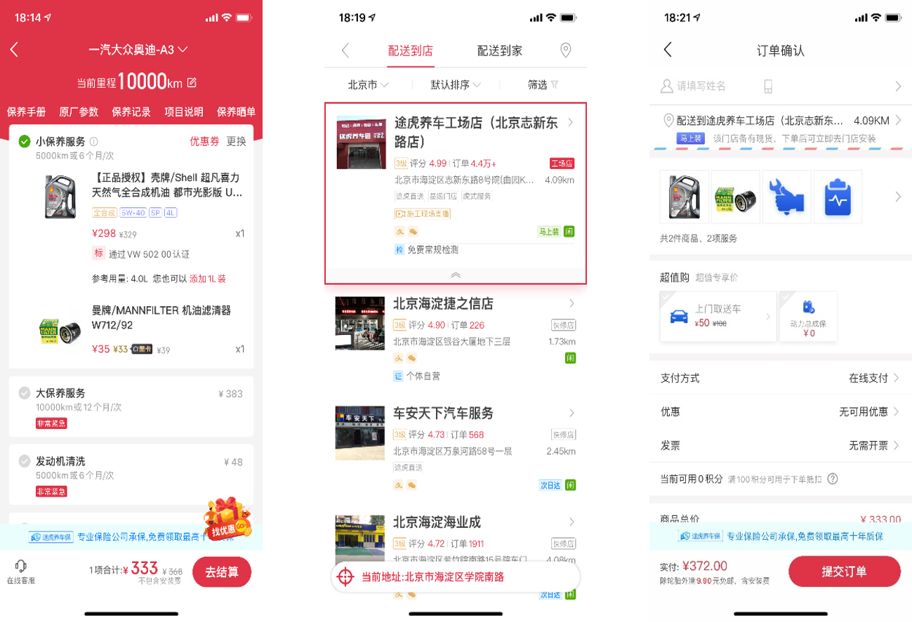 途虎养车定位于专业的“汽车养护电商平台”,在其App首页添加完车辆信息后选择“做保养”,出现大小保养套餐及配件选项,确认好项目后点击“立即购买”可选择门店,点击门店详情页可看到门店星级及用户评价,选择完毕后提交订单进行付款。