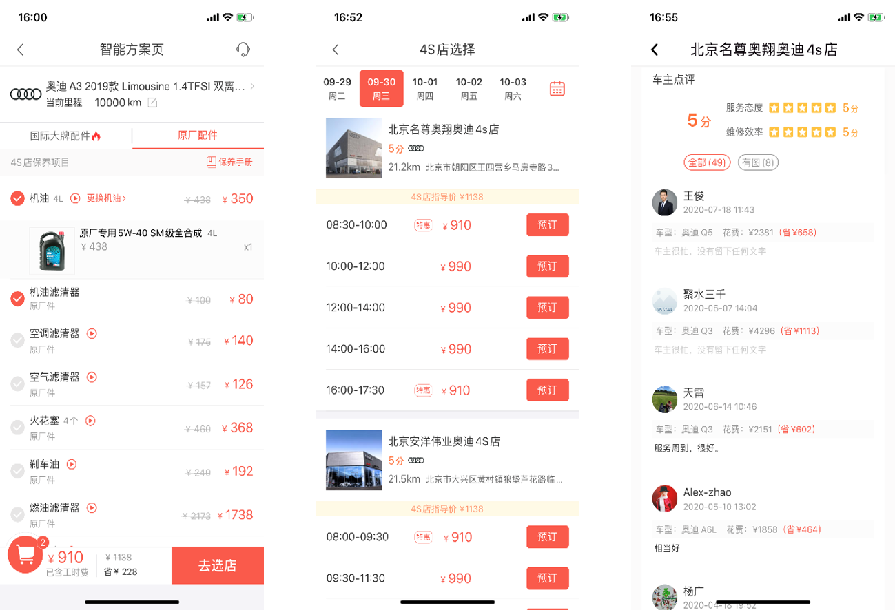 乐车邦成立于2015年,定位是4S店新零售服务平台。在选择服务前,我们先在首页顶部添加车型、公里数信息。点击“4S店保养”按钮后自行选择保养项目和配件类型(国际大牌配件和原厂件),然后选择预约时间和门店,在门店的详情页内,可以看到门店评分和具体的用户评价,全部选择完毕后在平台支付订单,整个线上流程就结束了。