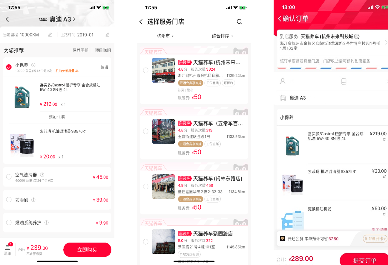 天猫养车是阿里巴巴旗下的汽车养护平台。使用流程为在首页添加车辆信息,选择保养,系统会自动展示保养配件组合套餐,如有其他需求可在列表中添加项目,门店详情页显示门店联系方式和车主评价,确认好项目及门店后,点击“立即购买”进行支付。