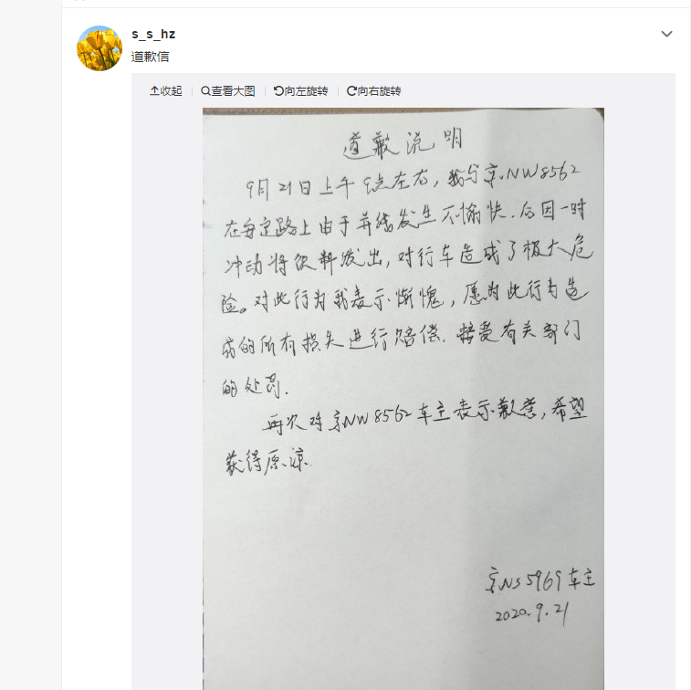21日晚,@s_s_hz发布道歉信称:由于并线发生不愉快,后因一时冲动将饮料发出,对行车造成了极大危险。对此行为我表示惭愧,愿此行为造成的所有失进行赔偿,接受有关部门的处罚。再次致歉,希望获得原谅。