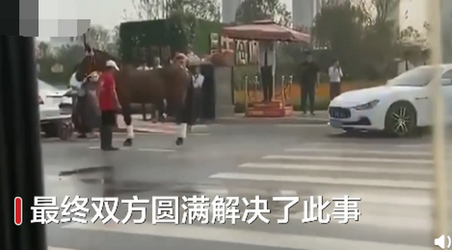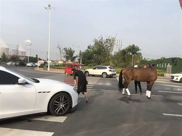 玛莎拉蒂女车主下车查看后,也急忙向马主人弯腰道歉,表示操作不当惊吓了马儿。