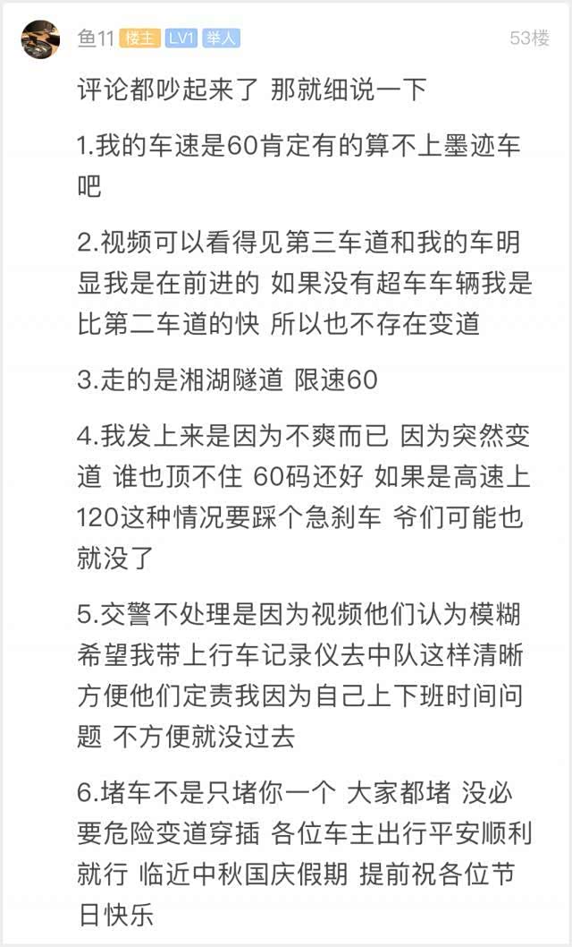 网友@取什么大名呢:我想问的是把你撞了吗?如果没撞的话没必要这样发出来指责别人变道什么的,我想你自己在开车的时候也会有这种情况吧?看到不少人都是这样的观点,另一部分网友不淡定了。「楼主遵守交通规则还有错了?」