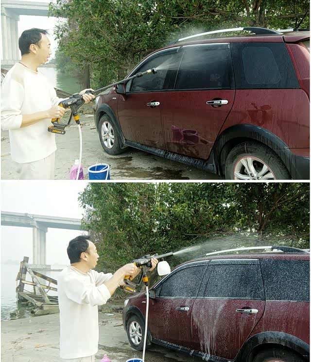 功能全试了一遍,车也洗好了,效果摆在那,没有对比就没有惊喜!最后总结一下吧:关于电池,满电开用,因为首次使用对电量续航没个把握,所以洗车时每个环节也不敢拖拉,完成就过,但也是因为首试并不熟悉,边摸索边使用,还要拍照,所以全程也不算很快,但最后电池续航表现还是满意的,毕竟洗好车冲刷完轮胎后按一下显示灯还有两个灯亮,后来淋花和洗了车垫,才剩一个灯,可见2.5A的电池续航还是能满足一般洗车时间的;关于喷嘴,出水流畅,雾化均匀,效果不错,不过15度跟25度区别不大,实用性重叠;关于操作,保险按钮跟握把开关需要适应,开始不习惯时握着枪是比较不容易按下保险按钮的,掌握后就好,枪管更换方便合理,综合效果与使用便捷性定调:值得拥有。