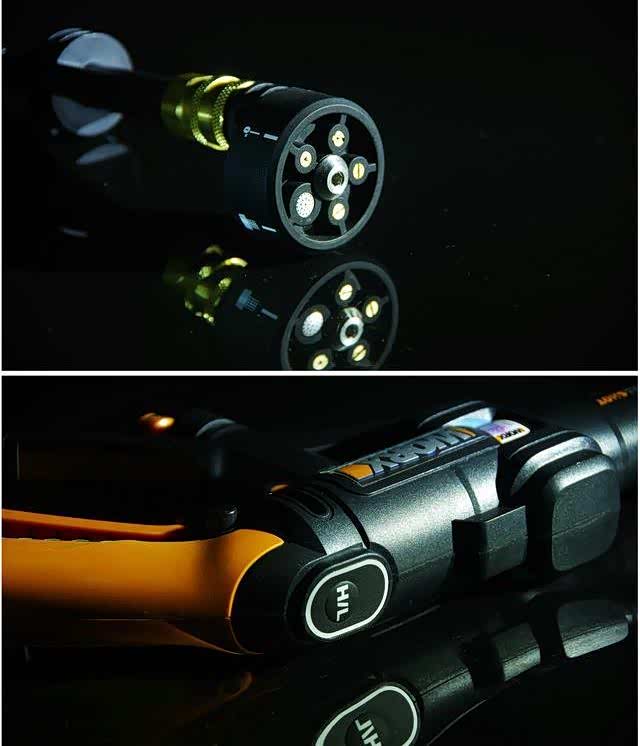 说到枪体,首先就要说说这个就像多管机枪的多功能喷嘴。在不大的圆周上均匀分布着5个大小不一形状各异的喷嘴,做工极为精细,从对应位置清晰标注了0~40度角喷射以及花洒模式,通过旋转选择不同功能,并用铜紧固件锁定在枪管上,这种灵活设计使得它很方便的用到每一支枪管上。另外,这枪还配备了两档威力,在H档增强压力,让再顽固污渍也无影无踪;L档则更省水省电,用于打湿车身,淋花等一般性清洁,两档设计可谓是无线产品兼顾电量续航力但又不失使用功能的一种考量。