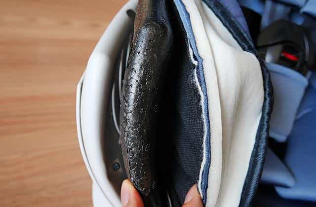 揭开座垫,可以看到整个座椅包裹基本可以分为三层,最外侧是PP一次注塑成型的椅身,韧性比较强;中间是选用了赛车头盔常用的EPP材料,缓冲吸能效果很好;最内侧也就是和身体接触的座垫部分,也有夹层海绵,透气性也不错。这样的设计可以给乘坐的儿童带来更舒适的乘坐体验和更加可靠的保护。