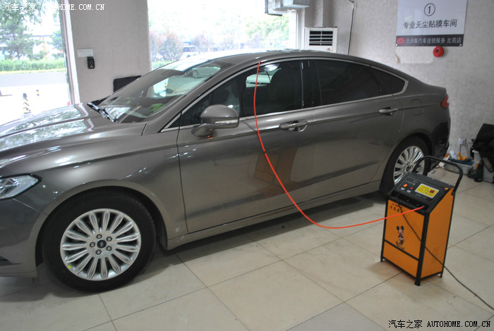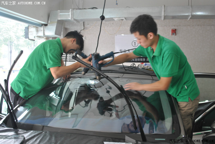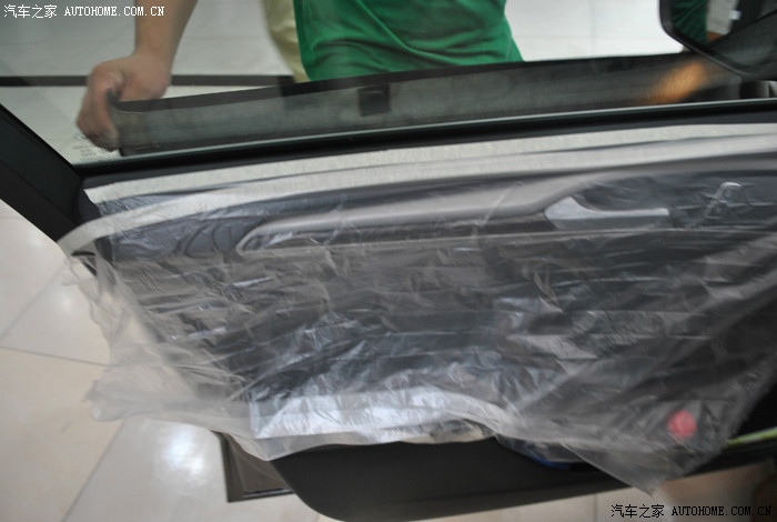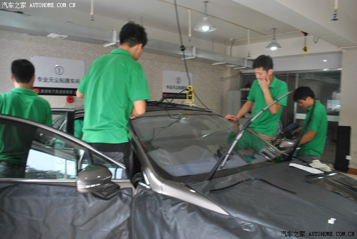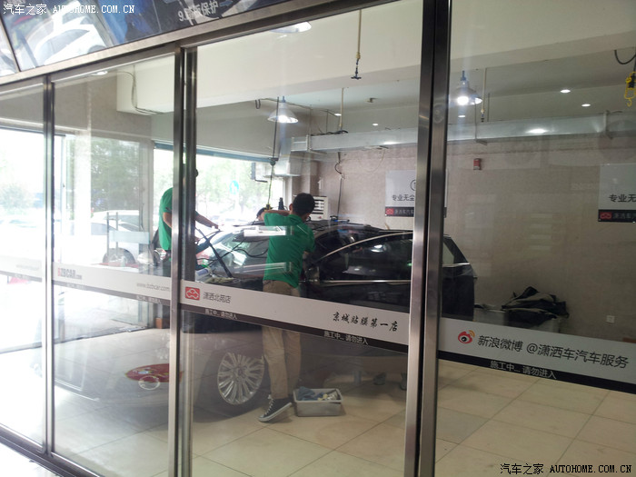 洗车后,开始贴膜。4-5个小伙子同时开工,仔细观察了一下,手法都非常专业,放心了(没有拿我的车练手的感觉,呵呵)。