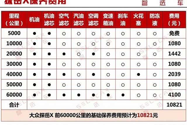 按照保养手册的具体要求保养下来,探岳X的小保养费用为1080元,小保养费用并不便宜,好在保养间隔较长。从表格中也能够看出,探岳X在60000公里保养项目最多,且保养费用也最高,达到4100元。最终累计到第60000公里时,其保养费用的总和为10821元。如果按照一年行驶2万公里来算,其每年的保养费用为3607元。