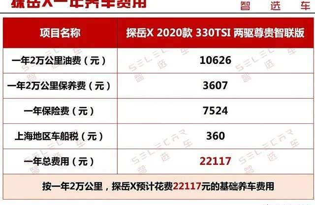 通过全文概要,我们大致可以了解探岳X购车、养车费用,其一年2万公里养车费用预计花费22117元。下面以指导价23.58万的2020款 330TSI 两驱尊贵智联版为例,看看它的各项详细费用如何。