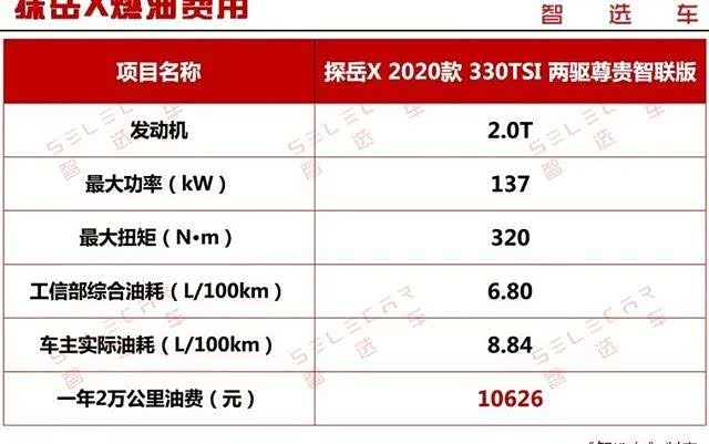 由于探岳X刚上市,所以暂时没有相关的车主实际油耗,我们就以探岳2.0T低功率发动机的车主实际油耗来计算。小智经过查询,探岳的车主实际油耗为8.84L/100km。如果以一年行驶2万公里计算,按照目前上海地区95号汽油6.01元/升的单价计算,探岳X行驶一年所需要的油费预计为10626元。
