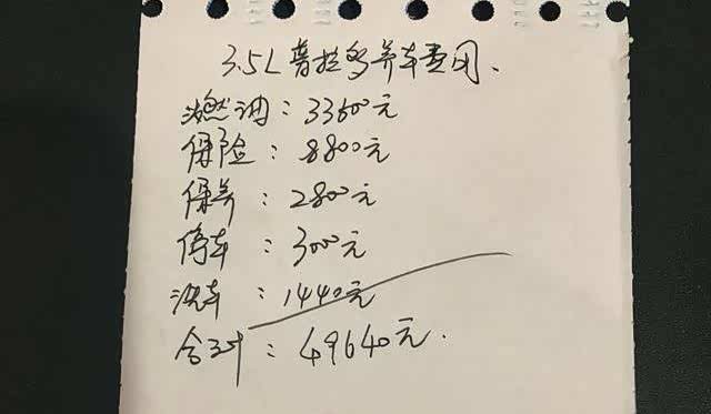 最后就是洗车费用,经常都用车的话,1周洗一次不过分,洗车一次30块可以洗很干净了,里里外外都能擦干净。一个月四次就是120元,一年1440元。所以综合下来,所有开销加起来,分别为油耗33600+保险8800保养2800+停车3000+洗车1440=49640元,平摊下来每个月开销4136元,这就是普拉多1年养车费用,算出来你可能不信,一般来说,真不低于这个数。