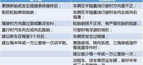 轮胎应当定期做动平衡检查,用动平衡检测仪检查。轮胎平衡分为动态平衡和静态平衡两种。动态不平衡会使车轮摇摆,令轮胎产生波浪型磨损;静态不平衡会产生颠簸和跳动现象,往往使轮胎产生平斑现象。因此,定期检测平衡不但能延长轮胎寿命,还能提高汽车行驶时的稳定性,避免在高速行驶时因轮胎摆动、跳动,失去控制而造成的交通事故。
