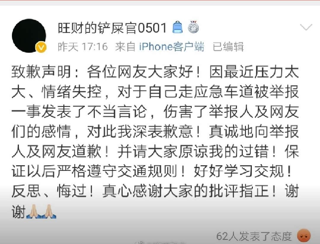 为此,该教授将微博号改名,并于28日下午5时许,发布致歉声明称,“各位网友大家好!因最近压力太大、情绪失控,对于自己走应急车道被举报一事发表了不当言论,伤害了举报人及网友们的感情,对此我深表歉意!真诚地向举报人及网友道歉!并请大家原谅我的过错!保证以后严格遵守交通规则!好好学习交规!反思、悔过!真心感谢大家的批评指正!”