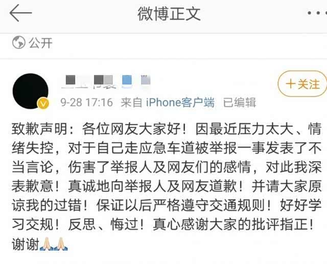 此事渐渐发酵,众多的网友纷纷在网络上指责他的过错,还辱骂他人,直到9月28日,顶不住压力的教授在网上发布了致歉声明:“感谢大家对我的指正和建议,因为最近压力确实有些大,在网络上发布了不好的言论,实属不该,伤害了举报人以及各位网友的感情,对此,我深表歉意,我不该因为自己的过失怪责帮我指正的好心人员,在此,我真诚的向举报人和网友们道歉,请大家原谅我的过错,在此也保证以后会严格遵守交通规则,反思、反省,再次感谢大家的关心和批评!”