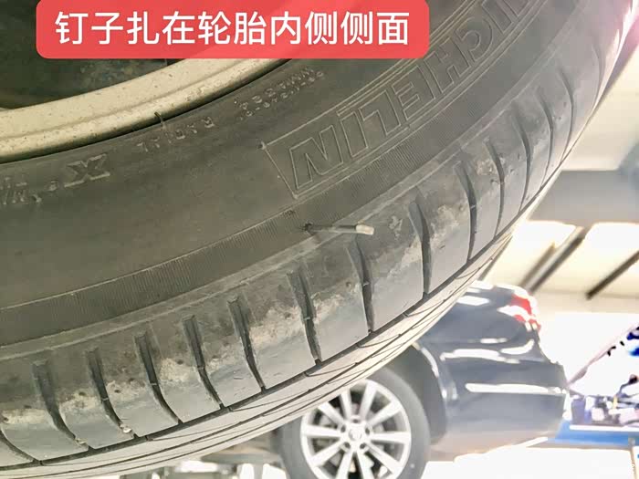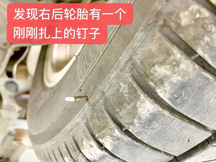 在右后轮胎的内侧发现了一个刚扎的长钉。,发现钉子不要贸然拔掉,首先要用肥皂水(有的人也许用唾沫)检查是否漏气,如果不漏气可以直接拔掉,如果漏气 那就需要补胎或者换胎,不拔掉钉子是为了补胎时容易找到漏气的位置
