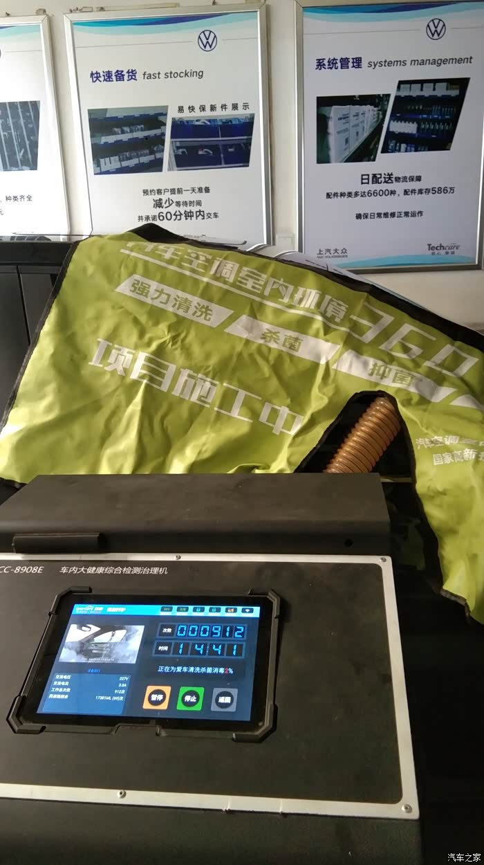 直接把车开到售后,一会4S店售后人员就过来接待了。4S 店售后人员询问我需要做什么我说消消毒。