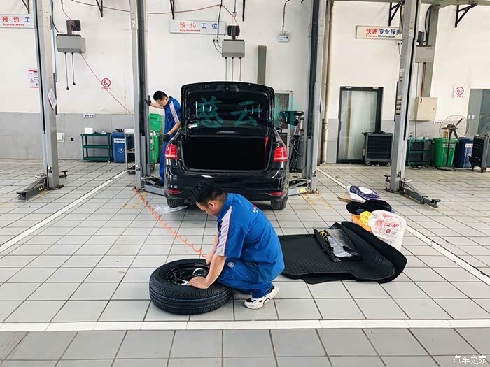 师傅在帮检查备胎的气压和老化情况。