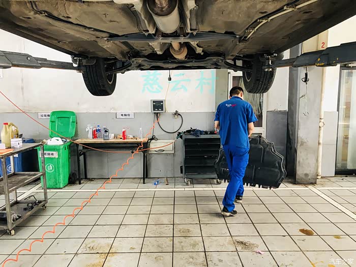 20分钟转眼即逝,清洗结束,车辆熄火,再升起车辆拆发动机下护板,准备下一步的放油作业。