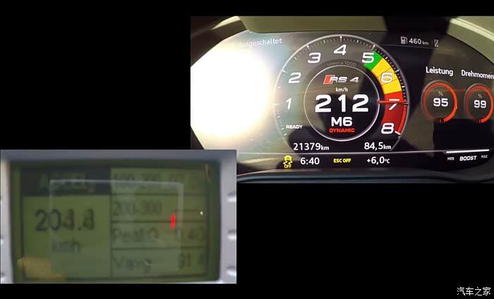 由于标配车道辅助,旁边有车的情况下除了后视镜的警示灯亮起,上门板饰条氛围灯甚至会变红,很有意思的设计。最后谈下性能方面,这台在保时捷Macan Turbo、Panamera 4S、Cayenne S上同款的V6 2,9双涡轮EA839发动机其实表现不俗,对比S4/5上的V6 3.0单涡轮EA839也做了不少针对强化,包括强化曲轴,曲轴轴承直径增加2mm,活塞销直径增加2mm并加入DLC高强度低摩擦涂层,更换更大的凸轮轴,中冷器由3.0的冷改水冷,活塞冲程从3.0的89mm降到86mm(这也是这台EA839排量从3.0降到2.9的原因)。但尽管做了如上强化,对比同级的M3与C63,RS4的动力水准应该只能以中庸来形容。450匹马力/600NM的扭矩,对比M3扭矩稍大,对比C63普通版则毫无优势,更别说C63S了。RS4实际的加速成绩也表现平平,如今大多数人只会看到0-100,但实际在路上发挥的空间更看重100-200。许多车友测过0-100在纯原厂情况下大多能超出预期在3.8s~3.9s左右(毕竟四驱),而100-200原厂最佳成绩目前只能在9.8s~10.2s左右,对比起C63与M3动不动100-200就原厂9.5s左右的成绩,RS4的后段加速毫无优势。如果要说改装的话更没好到哪去,M3的二阶100-200随时可以做到7.5s左右,而C63的一阶硬件纯原厂则是轻松做到7.8s左右,而RS4刷程序做到550ps~580ps实际100-200也只能做到8.2s~8.5s左右(有更快的欢迎修正),德国HGP近期做了一个“Stage2”,但实际也对涡轮以及水冷器进行加大更换,但最终615ps的机头马力也仅仅跑出7.0s整(此成绩数据存疑,youtube上有其他人测试只跑到7.5s)。相较于目前非常成熟的S4/5的EA839三阶改装(S4/5二阶只能做到460ps/680nm左右),在改装到相同的马力(580匹左右)下,S4/5的100-200成绩明显优于RS4。