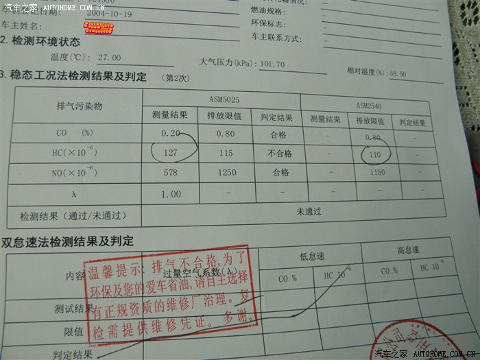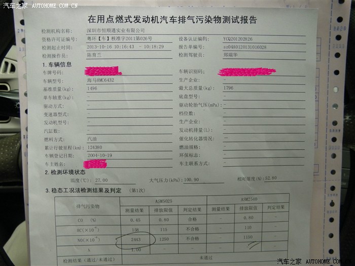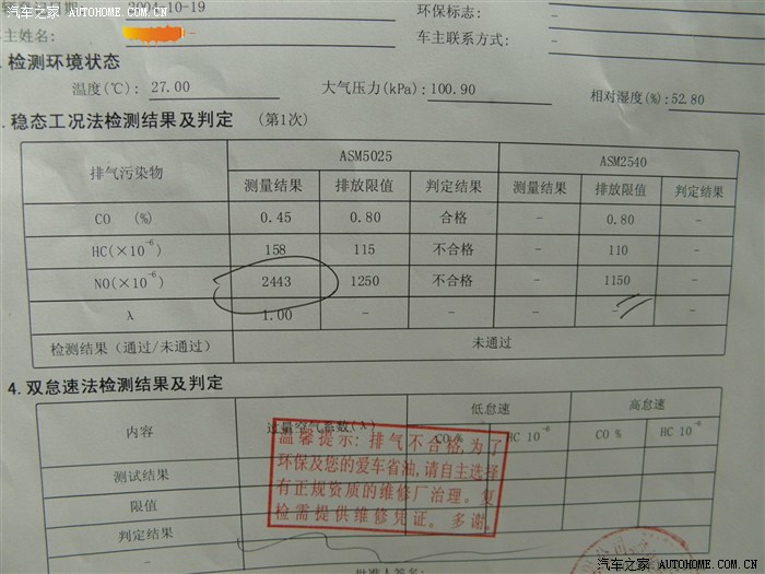 十月老马要年审了,但是因为国庆节假期的一起事故,等待车辆维修完毕后已经过了中旬了,赶紧去检测站办年审。结果很悲催,排气有2项不合格,超标了,其中一项是要命的三元催化器的问题,这下麻烦大了。因为是自动检测,我在显示屏上一看到结果,心里就咯噔一下,这下估计要破费了。