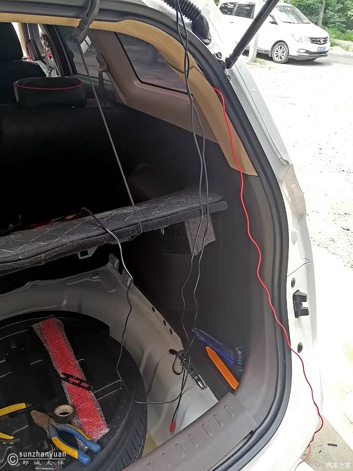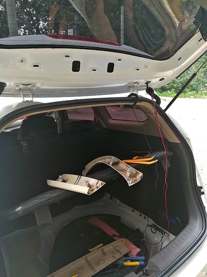 后门板拆下后,摄像头的线也要用铁皮拉着线从车身和尾门连接管那里拉到尾门里面(这个比较麻烦)。要有耐心。