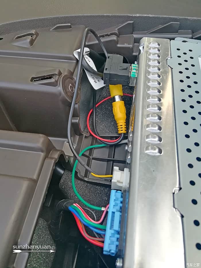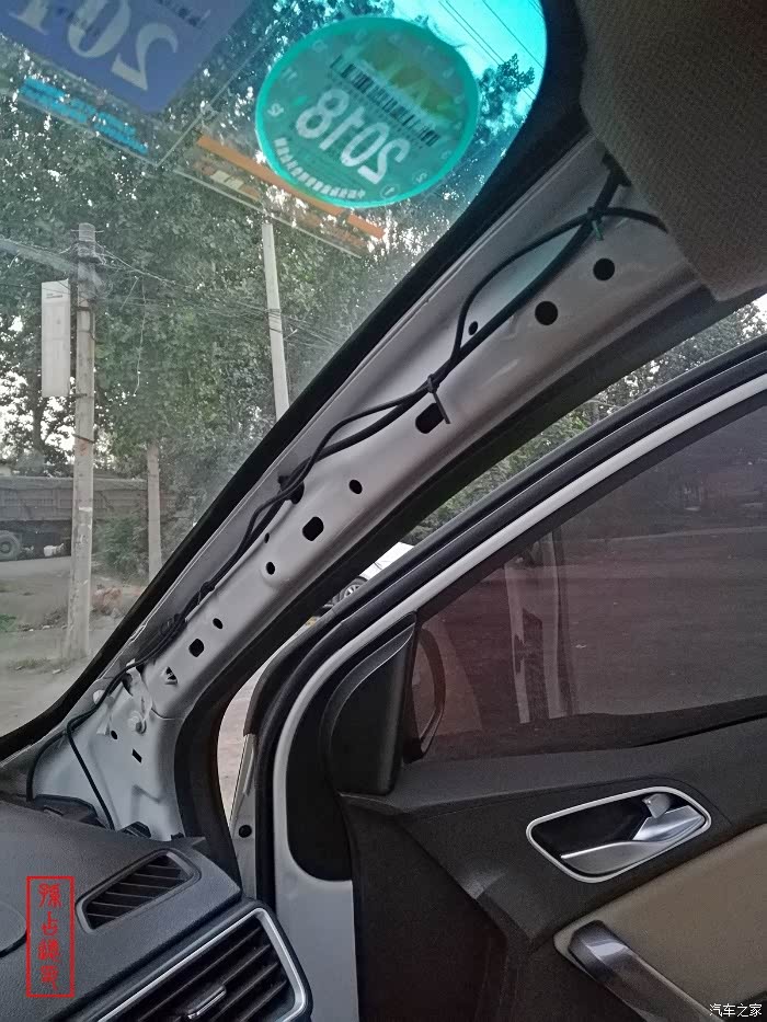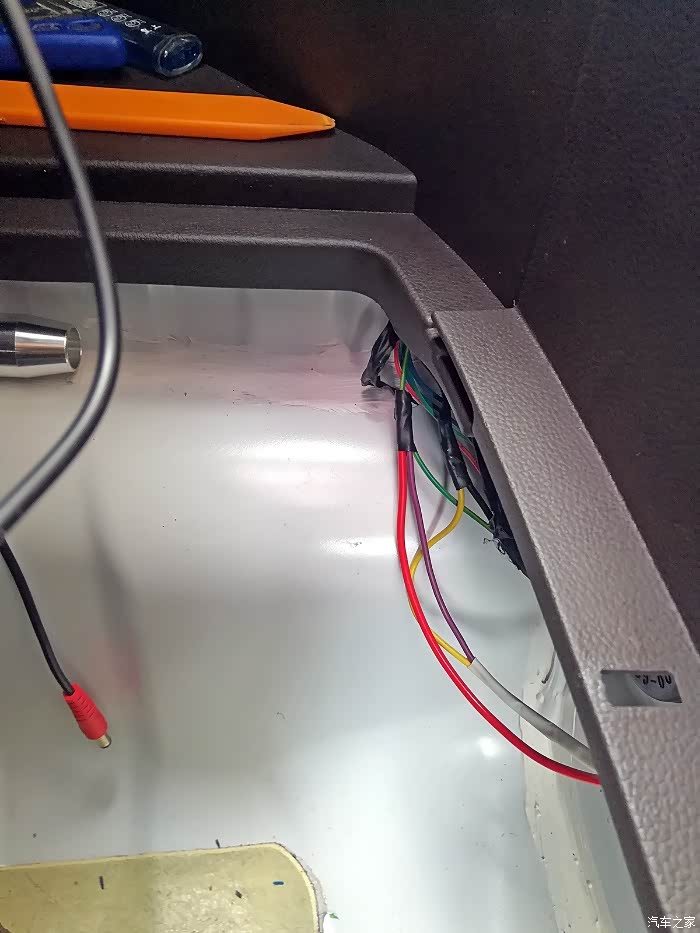 然后拆右侧A柱装饰盖板,没有螺丝。就几个卡扣,很容易。然后把视频线从A柱那里一直往车尾部延伸(车侧布线简单,门框密封条扣开一点塞进去就行。)