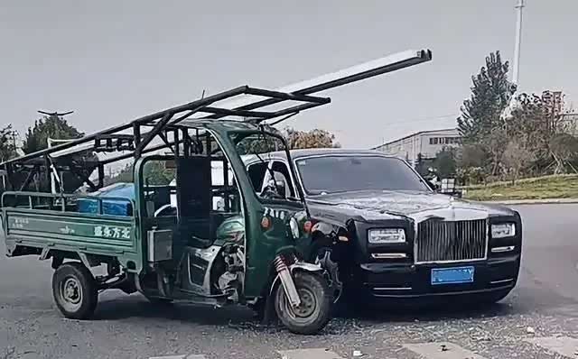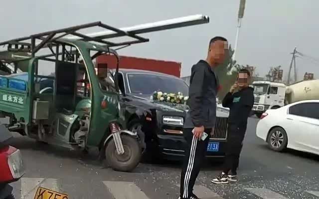 就是上图这般情形,一辆十分有辨识度的豪车,垂直方正的大脸,迷离的大灯组合,稳重的车身线条,它就是车界上的扛把子劳斯莱斯。很不巧的是,这辆车头还有扎花,把手上也系得有彩带,它的身份今天就是一辆婚车,在这里却被三轮车给了一次“爱的吻”。从该段路段背景可以看出,这是一个有信号灯的十字路口,且该劳斯莱斯与三轮车紧紧地挨到了一起,并且三轮车直接来了一个斜靠。