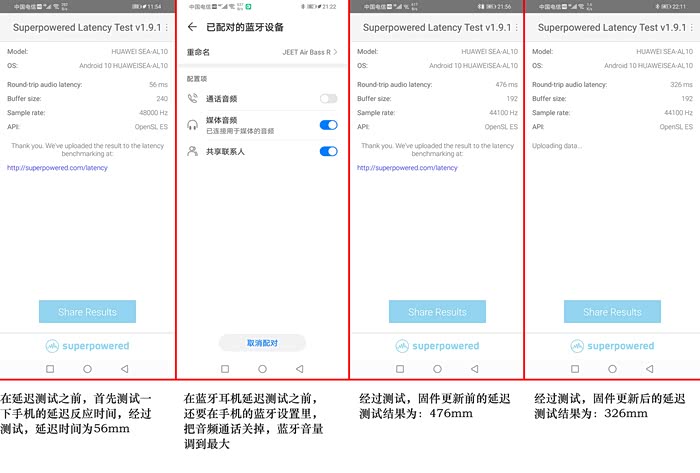 这是我通过Latency test应用为蓝牙耳机进行延迟测试试验的截图。用该软件进行测试,得到的具体数值虽没有专业设备那么精确,但对于使用者来说,已经非常不错了,与精确的数值差别不是很大。在测试之前,首先要测试一下用来测试手机的延迟,以我所使用的华为Nova 5 Pro来说,自身运算所需时间为56mm,打开蓝牙,连接耳机,关闭蓝牙的语音通话音频选项,否则测试出来的是手机自己的音频。把蓝牙音量调节到最大,出声口放在手机的MIC位置,开始测试。在蓝牙固件升级前,得出的数值是476mm,这个数值不是耳机实际的延迟时间,需要用476减去手机运算的56,再除以2.有人会问,为什么要除以2,那是因为,声音从手机发送的耳机需要时间,通过耳机再传回手机还需要时间,而我们需要得到单程的时间才是耳机具体的延迟时间。通过简单计算,(476-56)/2=210。在耳机固件升级前,延迟时间为210mm,有点高了。