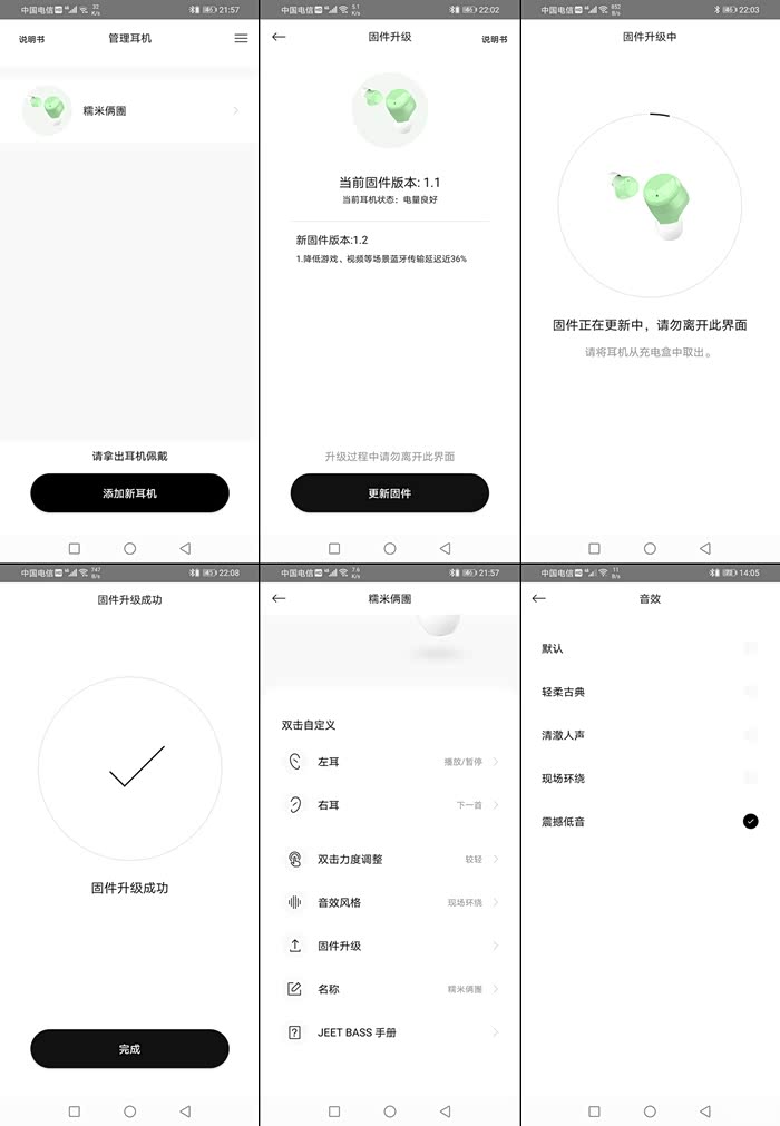 将耳机连接手机蓝牙,打开APP应用即可操作,具体操作流程就不具体说明了,看图片演示吧。使用手机APP有一项非常好的功能就是给耳机固件进行升级,达到更好的体验效果。