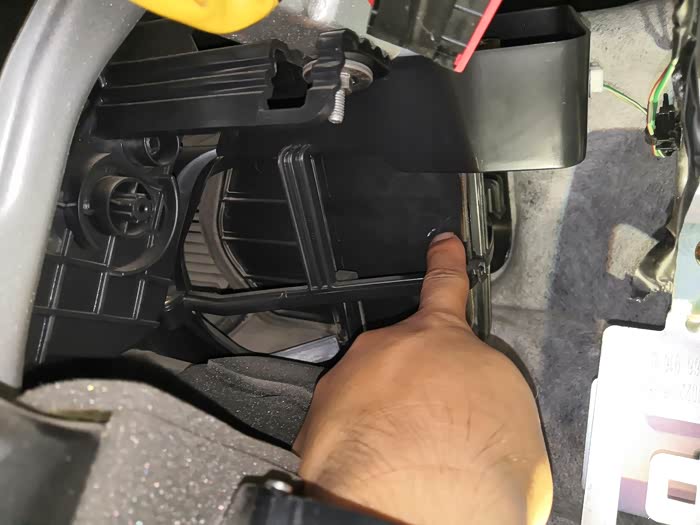 这个空调新风系统在手套箱上前部,必须拆才能够到。