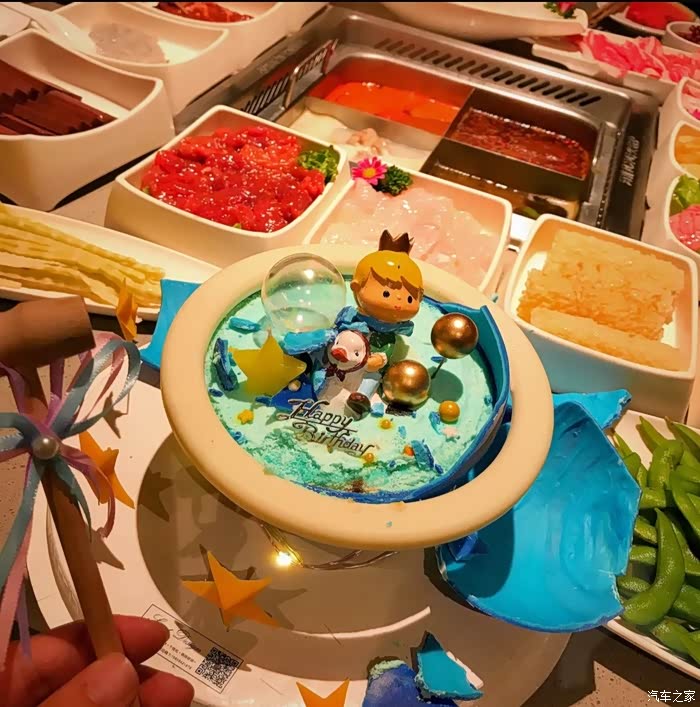 海底捞火锅,生日大爬梯的聚集地!尤其是对他们家的生日小玩具很期待(我是拿来给女儿的,知道我要去海底捞,他就惦记人家送的玩具)……这家也算是来过几次,,环境不错,服务也是依旧热情……可能最大也就是八人桌了……嗯,火锅确实不太适合大桌。菜品质量还是很稳,菜色也是有季节性更新的,但是最爱的翡翠墨鱼滑只能存在于记忆中了……新出的青花椒锅底只能说是不太出彩……大棒骨锅里面的脆脆肠想多吃几个,这次人家说要收费了,即便是菜单上木有……另外像是饮料也有了新增,,还是很不错的!有“小王子”蛋糕的,,收到了海底捞玩具!!还是“”……总的来说蛮开心!!