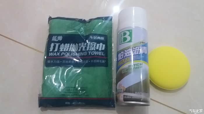 这就是今天的主角:柏油沥青清洗剂(据说能迅速渗透、溶解及清除汽车表面的柏油、沥青、油渍、污垢。具有祛污、清洁、上光的效果,令清洗物表面恢复亮泽,光洁如新)、一块打蜡抛光擦巾(质地柔软,不会划伤清洁物表面)。