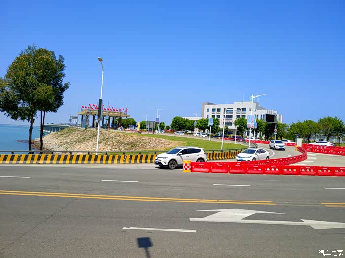 不远处顶上插满红旗的就是进岛的收费站,平时这10公里跨海大桥要96块钱一次,今天免费