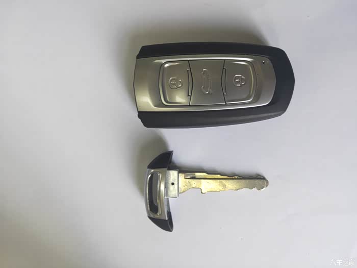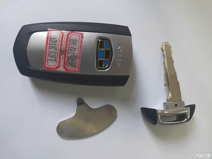 博越的车钥匙侧面有个小按键,这个按键是机械钥匙的取出键,按下此键,则可取出机械钥匙,机械钥匙可以在遥控钥匙的电池没电的时候,用机械钥匙开启车锁,开启车锁进入车内后,将没电的钥匙放在中央扶手的水杯底座下,则可以顺利点火启动车辆。