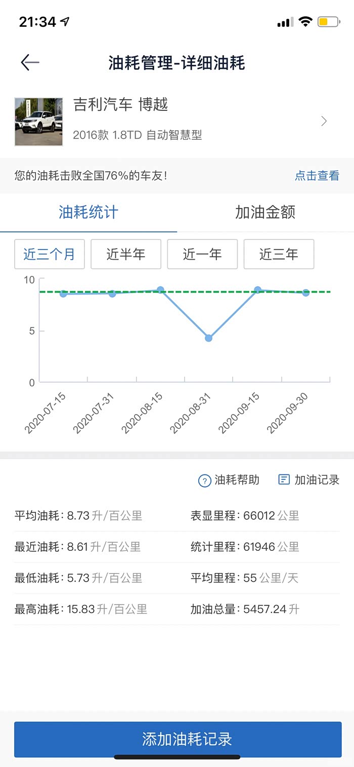 作为一个1.7吨的大家伙,博越的油耗真的没有那么高,百公里8.7L的油耗,足以为博越正名,让我们向经验主义say no,通过观察使用过的油耗记录软件,发现比我油耗还低的朋友大有人在,也希望大家能够正视SUV车型,不要人云亦云。